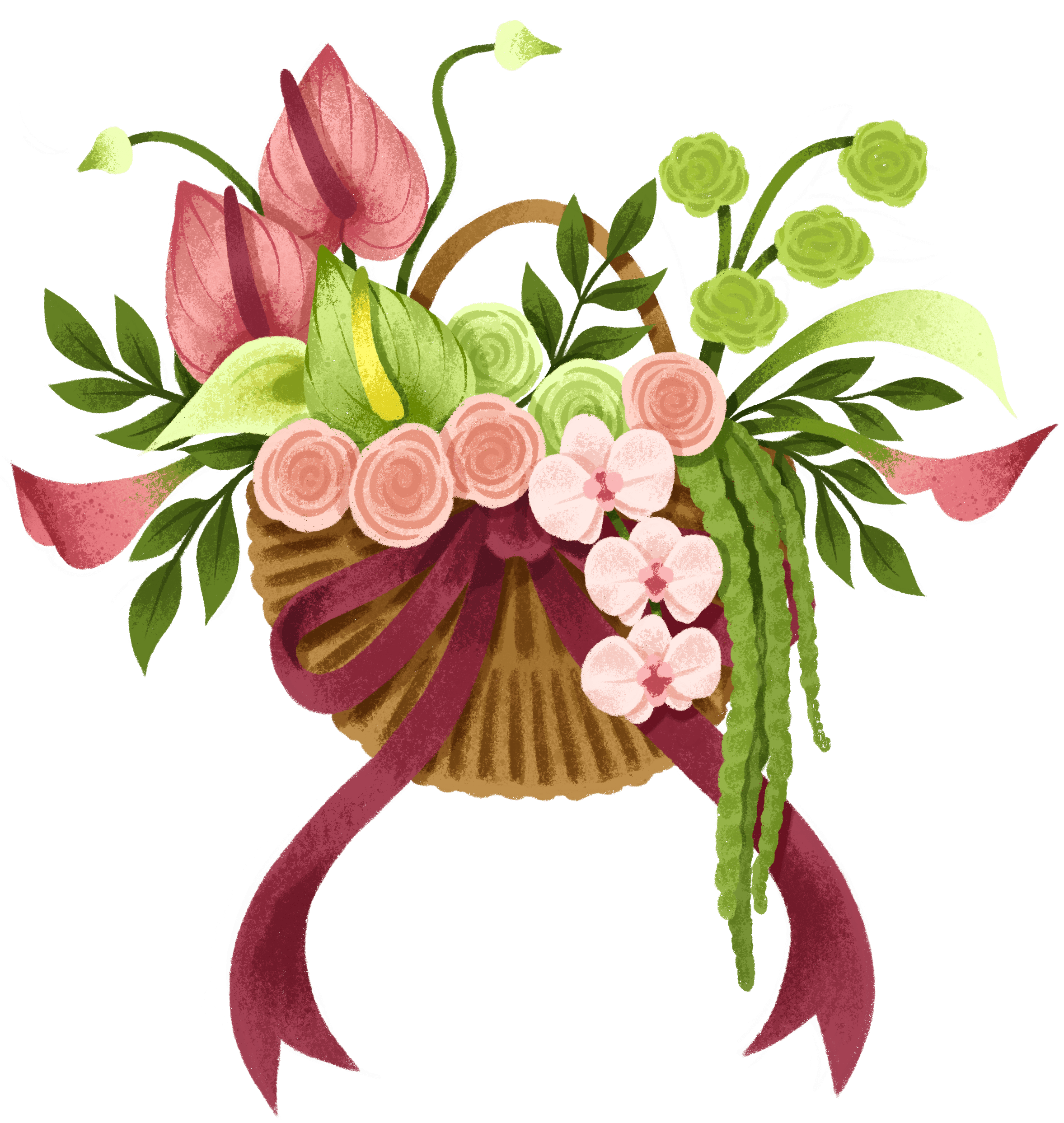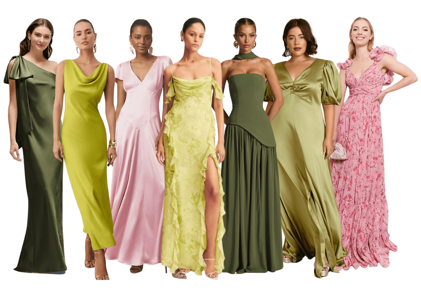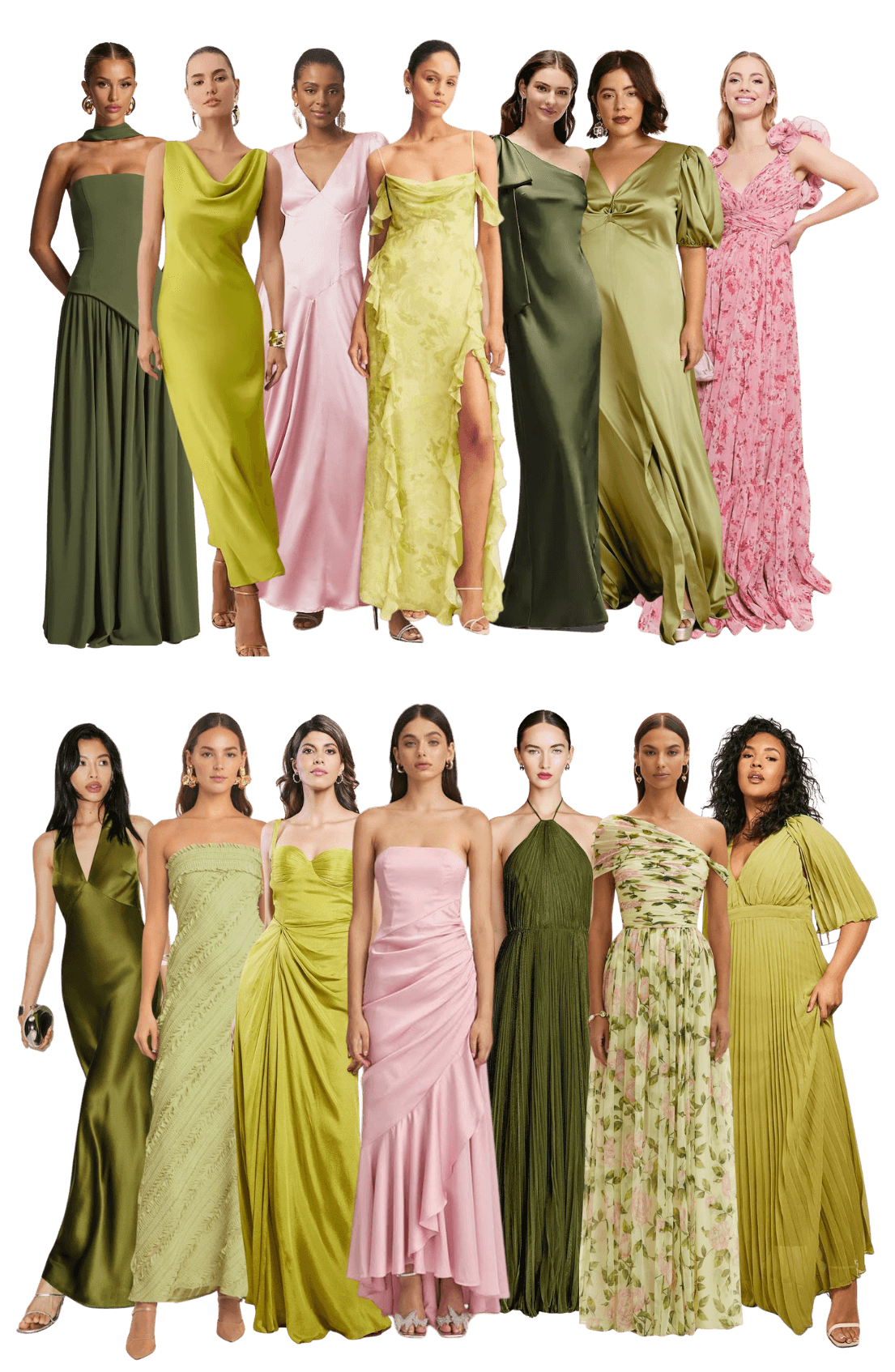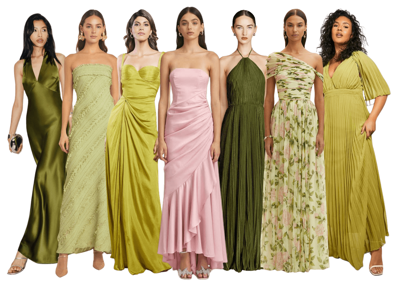 Inspired by the colors of a spring garden, our palette features deep olive tones, mossy greens, chartreuse and warm blush pinks. Guests are invited to dress within this color range to complement the celebration.