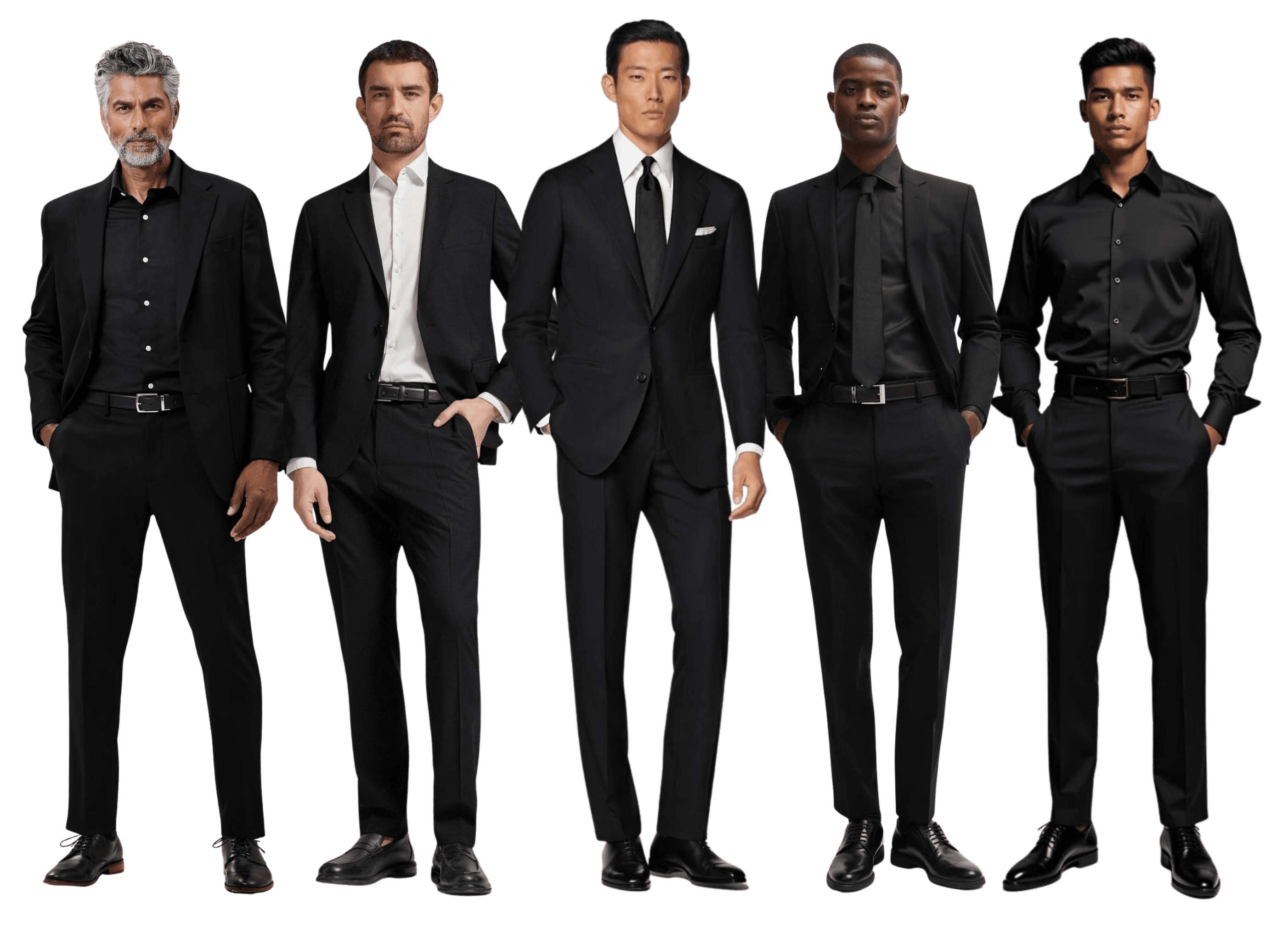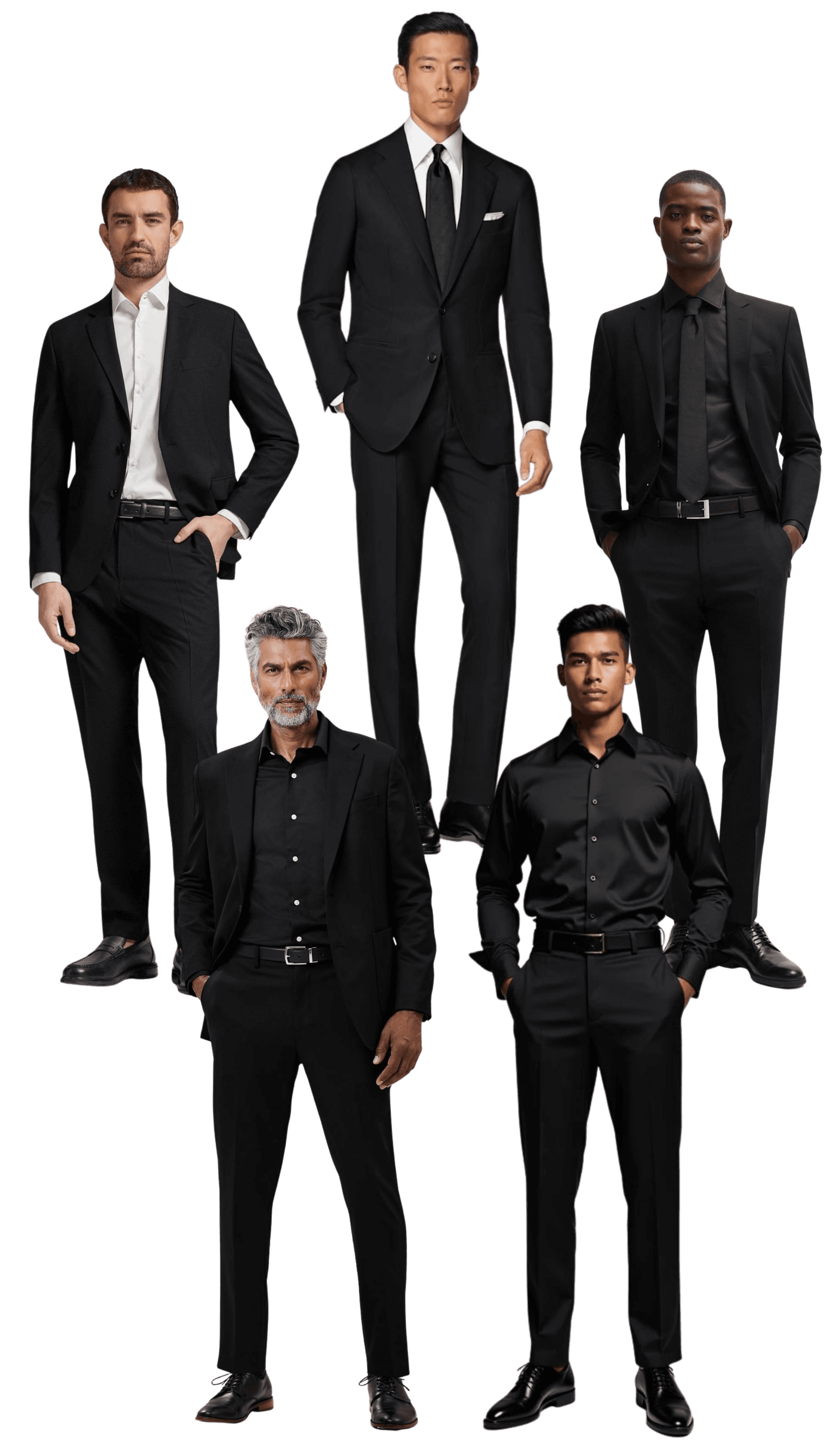 A clean, polished look is encouraged for the gentlemen. Guests may wear a black suit with a dress shirt and a black tie, or a black polo or button-down paired with black trousers and dress shoes.